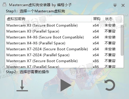 - 根据您的Mastercam版本,选择对应的虚拟狗版本,然后在下方根据需要选择“安装/卸载”、“启用/停用”或“重启”。
